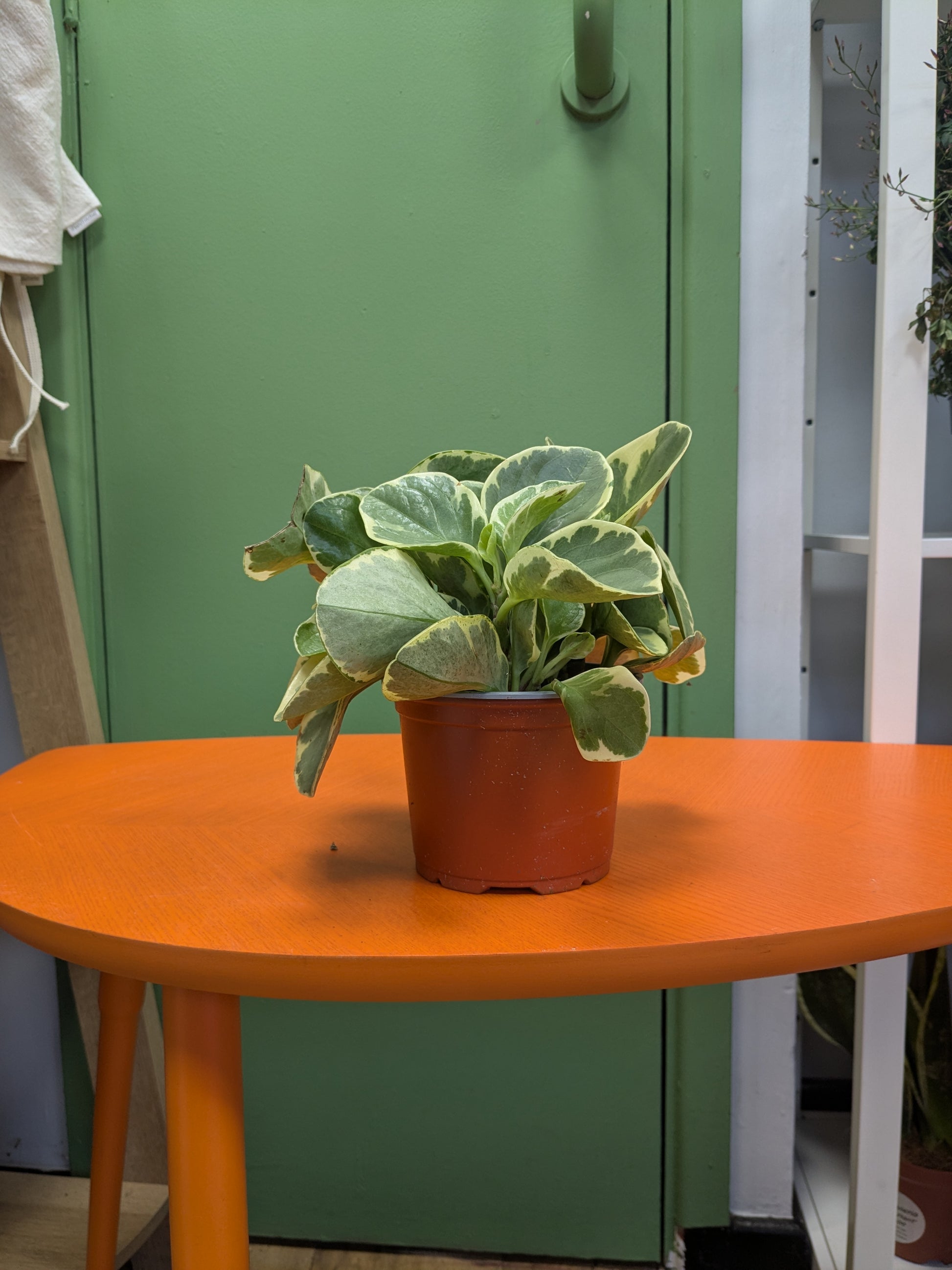 Compact and charming, this variegated pepperomia brings a splash of creamy white and green to any room. Perfect for desks, shelves, or windowsills, it thrives in bright, indirect light and needs minimal fussing—just water when the soil feels dry. A delightful little plant that grows slowly and steadily, adding personality without demanding much attention. Ideal for plant parents of all levels.